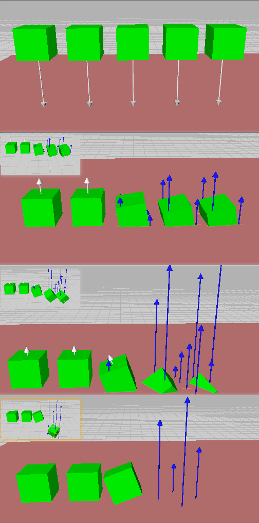 The image below shows 5 rigidbodies falling to the ground with masses of 1kg, 10kg, 100kg, 1000kg, and 10,000kg (from left to right).